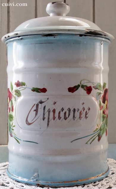 ベースのお色はブルーのグラデーション。パンジーはステンシルで描かれ、「Chicorée」(チコリー入れ)の金彩文字はカリグラフィー(手書き)で入れられてます。