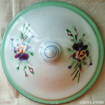 向かってお花の左上付近に、ヒビによるホーローの欠けがあります。(白っぽく見える箇所です。)